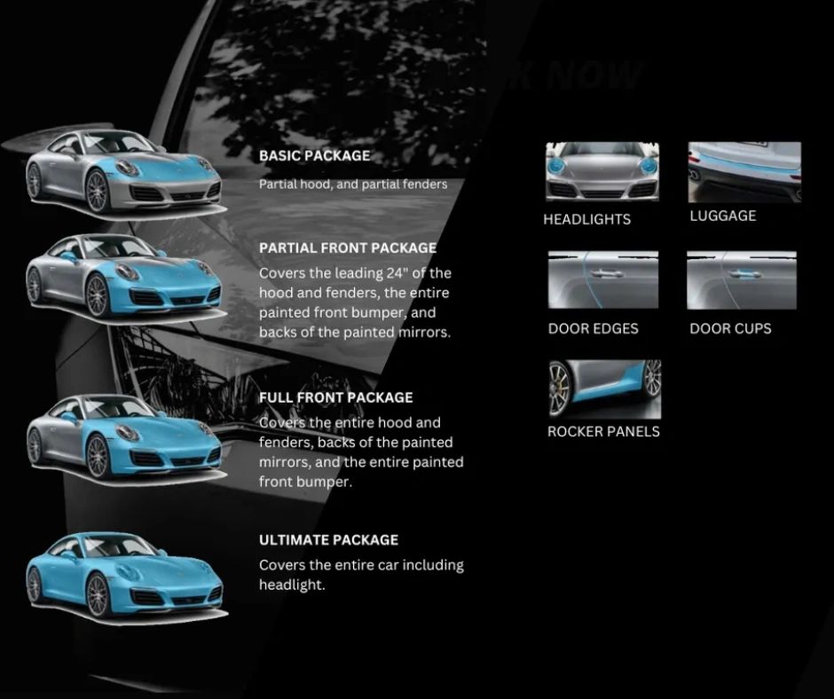 PPF is a thick transparent film that is applied to any part of the Vehicle to protect the paint from any damages such as: Rock chipping, Development of rust, and small impact Benefits are listed at the top of the website